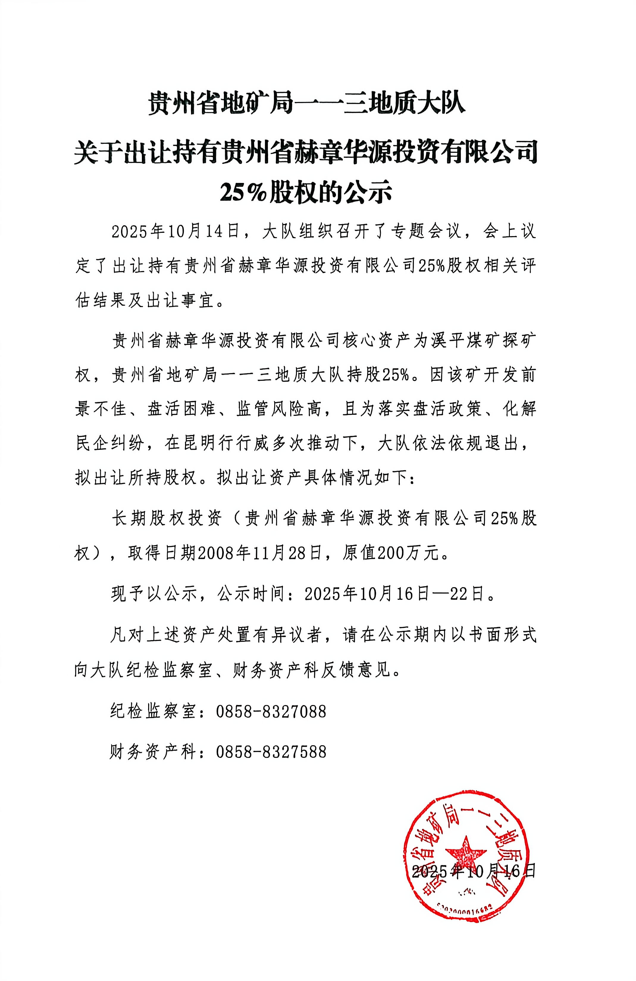 贵州省地矿局一一三地质大队关于出让持有贵州省赫章华源投资有限公司25%股权的公示